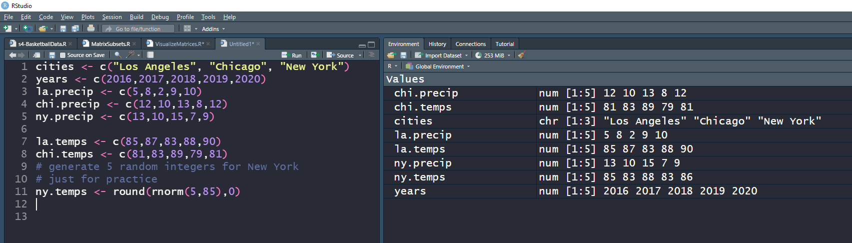 To start this practice exercise, I create two matrices. The first matrix is average precipitation in inches over five years for three cities. The second matrix is average temperature in degrees Fahrenheit for the same three cities and date range. All of this data is fictitious.