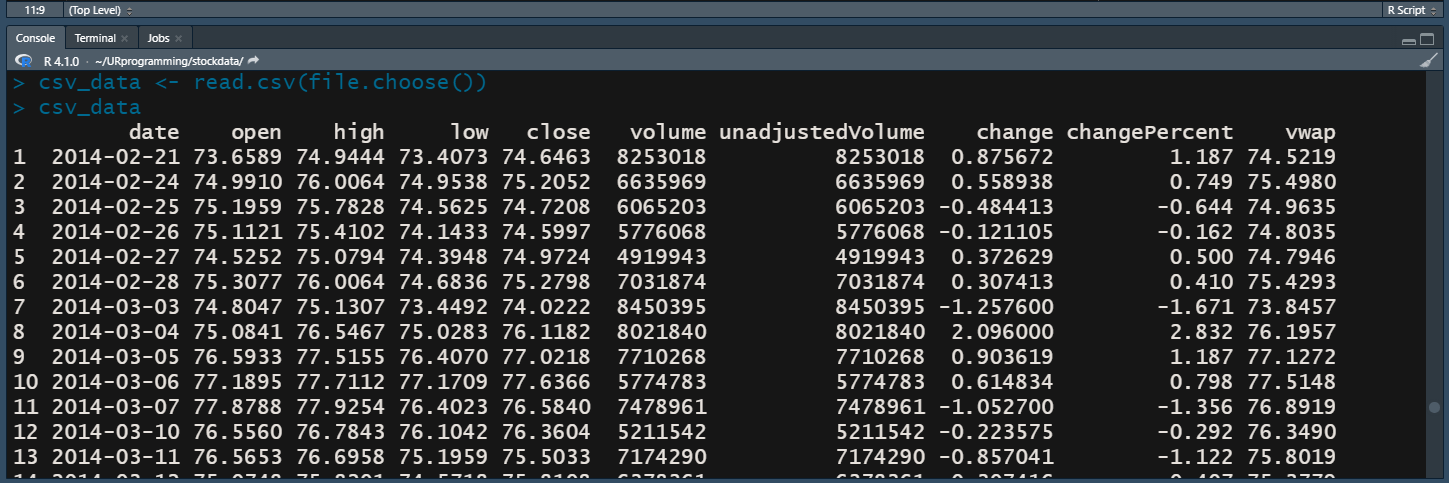 To set the current working directory, use the setwd function. For Windows operating systems, use the “\\” path separator to escape back slashes as in many other programming languages. For *NIX based operating systems, use the “/” path separator. Note, for my demo, I downloaded some stock ticker CSV data from Kaggle.