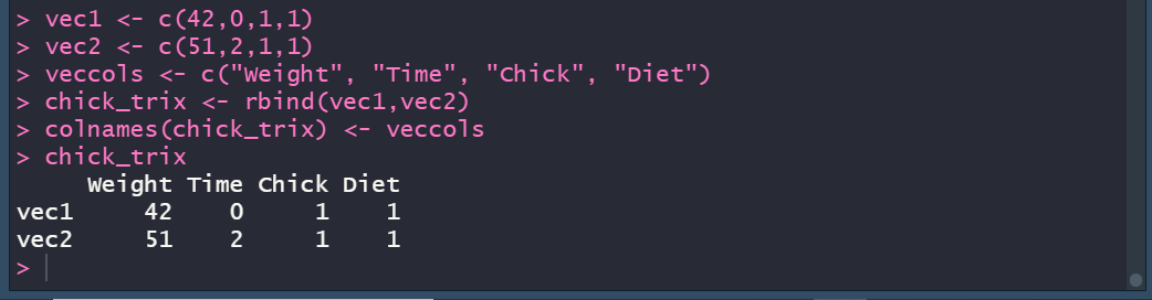 > is.matrix(chick_trix) # a matrix is only a matrix; not a list and a matrix