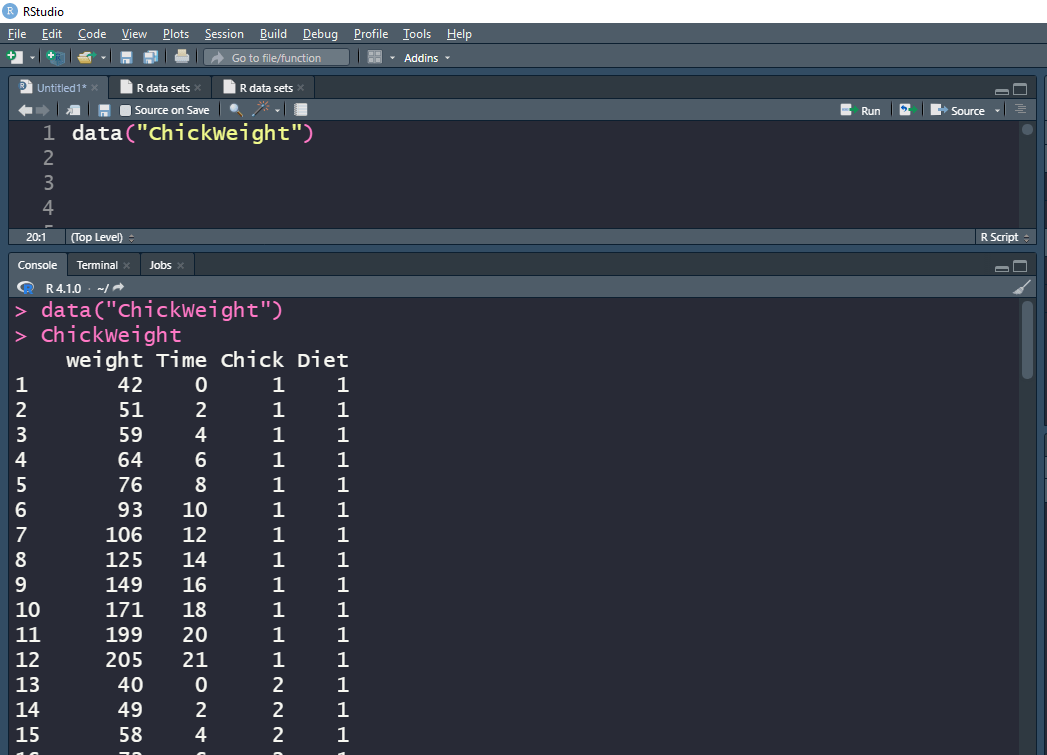 Here, we see the index and then column names. Note that a detailed explanation of the ChickWeight data frame can be found on the R documentation site. Briefly though, we’re looking at a unique identifier for every chicken (Chick) on a given diet (Diet). The metrics are then, the chicken’s weight over a given number of days (Time) for that specific diet. The chickens happen to be ordered by their final weight on the diet.