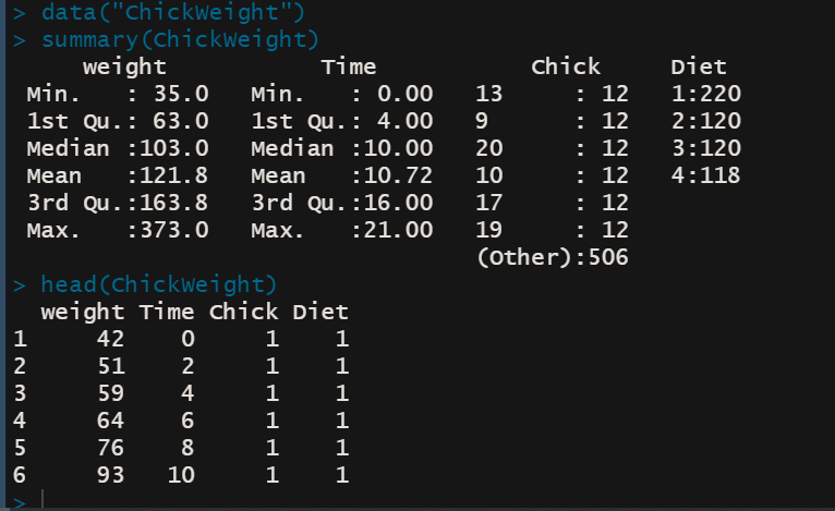If I want all ChickWeight rows with a weight less than 60, that would look as follows: